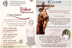 Irmã Maria Aparecida Ferreira dos Santos, Missionária Capuchinha, se encontra em acompanhamento na etapa de Formação Noviciado e dia 16 do corrente mês, irá realizar a primeira profissão religiosa na Igreja do Seminário Seráfico. As Comunidades de São Bernardo, Mãe Rainha e Santo Antônio e demais comunidades que pertencem a Área Pastoral, durante esta semana, realizam o Tríduo Vocacional em preparação e em homenagem ao ano vocacional. O Tríduo está sendo animado pelas Irmãs Missionárias Capuchinhas, Frades Capuchinhos e o povo das Comunidades. Acompanhe! Participe! Sua Presença será importantíssima. Uma oportunidade para você descobrir ou animar sua vocação.